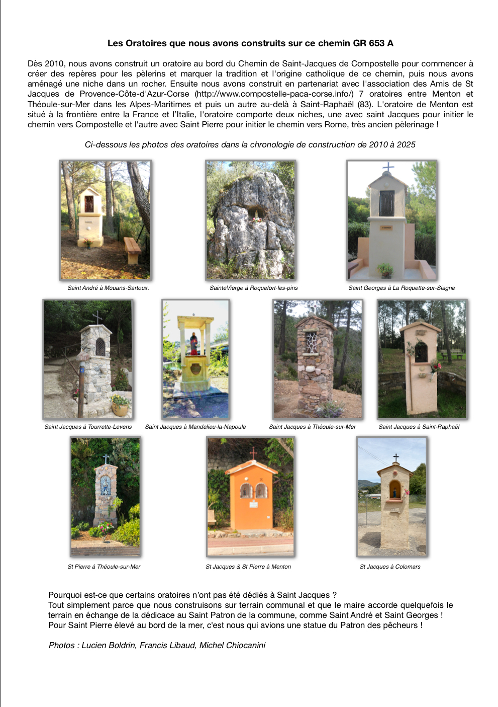l'historique de chaque oratoire, avec à chaque fois un extrait de